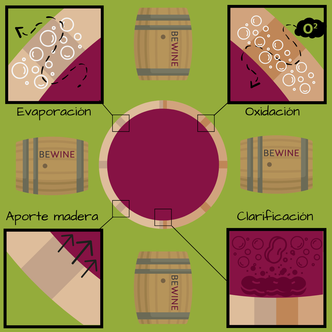 : los mismos canales por donde se evapora el vino, son utilizados por el aire para entrar dentro de la barrica. Una vez que el oxígeno entra en contacto con el vino, comienza a unirse a diferentes compuestos que se encuentran en él y los transforma en compuestos nuevos. Estos tienen aromas y sensaciones táctiles en boca diferentes a los anteriores.