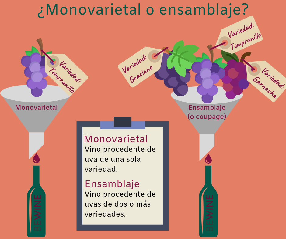 Un ensamblaje (o coupage), procede de la mezcla de dos o más variedades de uva en la misma botella.